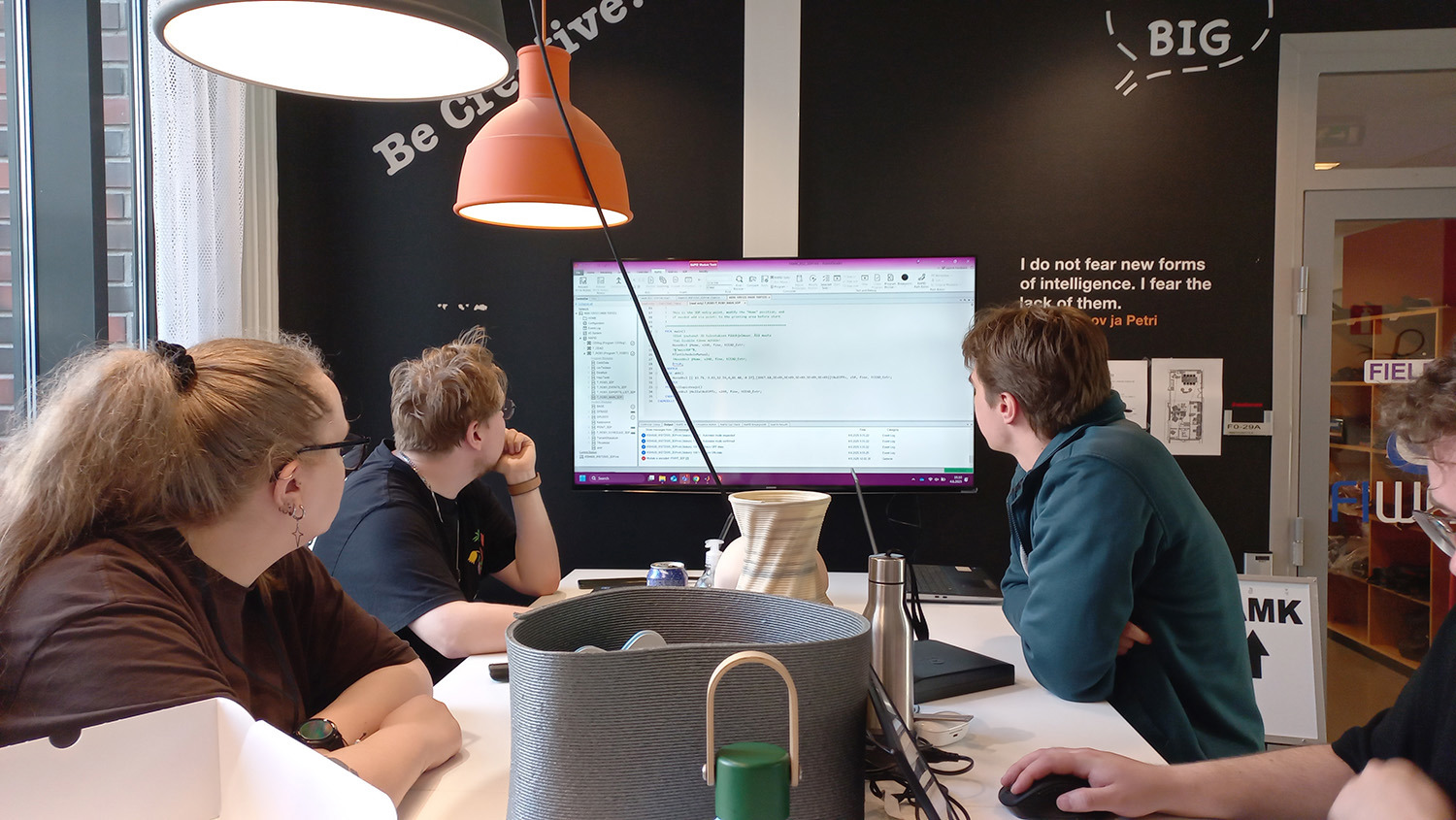 Working with the advanced 3D printing cell at TAMK, the group explored different ways of designing and controlling toolpaths, material flow, and print strategies. The session allowed both teams to explore new programming methods and gain a deeper understanding of how visual programming can be adapted to different robotic cells for digital fabrication.